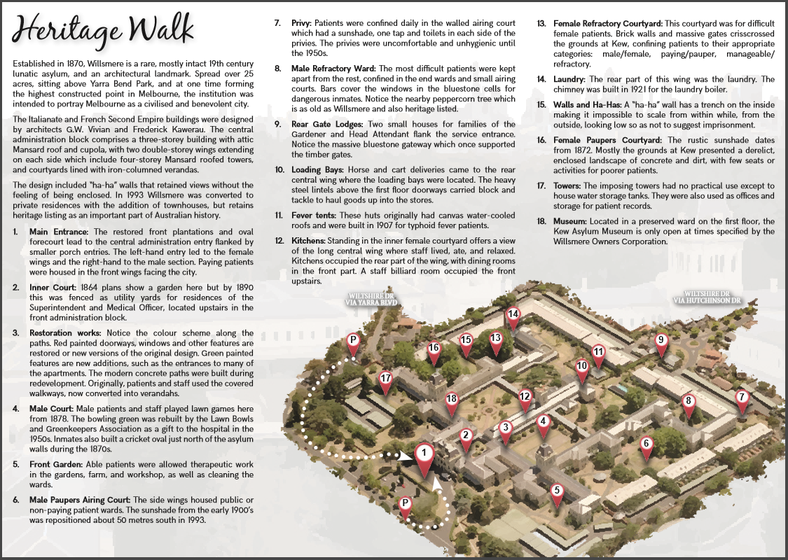 This useful brochure includes interestring facts about Willsmere as well as a map for a self guided tour that shows a selection of interesting aspects of the building design.